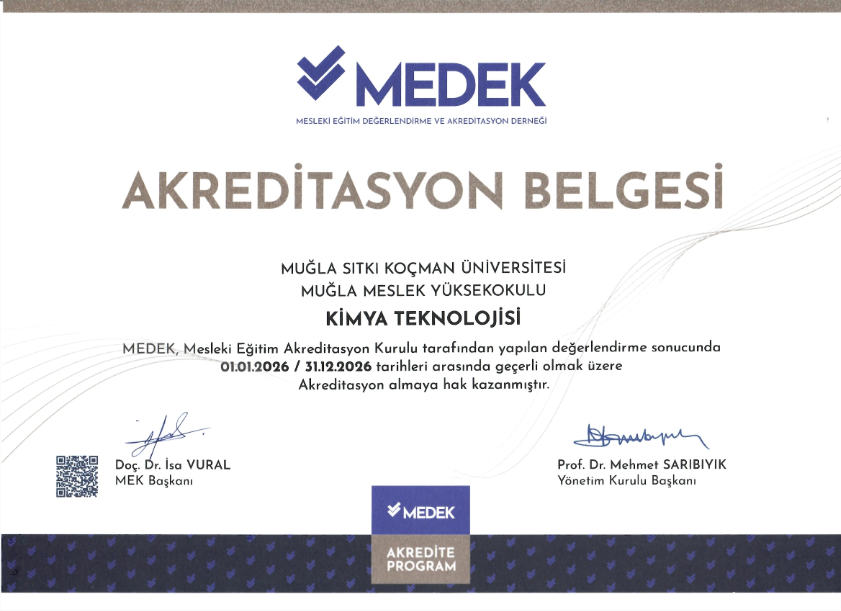 Bölümümüz Kimya Teknolojisi Programı Mesleki Eğitim Değerlendirme ve Akreditasyon Derneği (MEDEK) tarafından yapılan değerlendirme sürecini başarıyla tamamlayarak 1 yıllık akreditasyon almaya hak kazanmıştır. MEDEK akreditasyonu; eğitim-öğretim faaliyetlerinin belirlenen kalite standartlarına uygunluğunu, program çıktılarının yeterliliğini ve sürekli iyileştirme çalışmalarının etkinliğini belgeleyen önemli bir göstergedir.